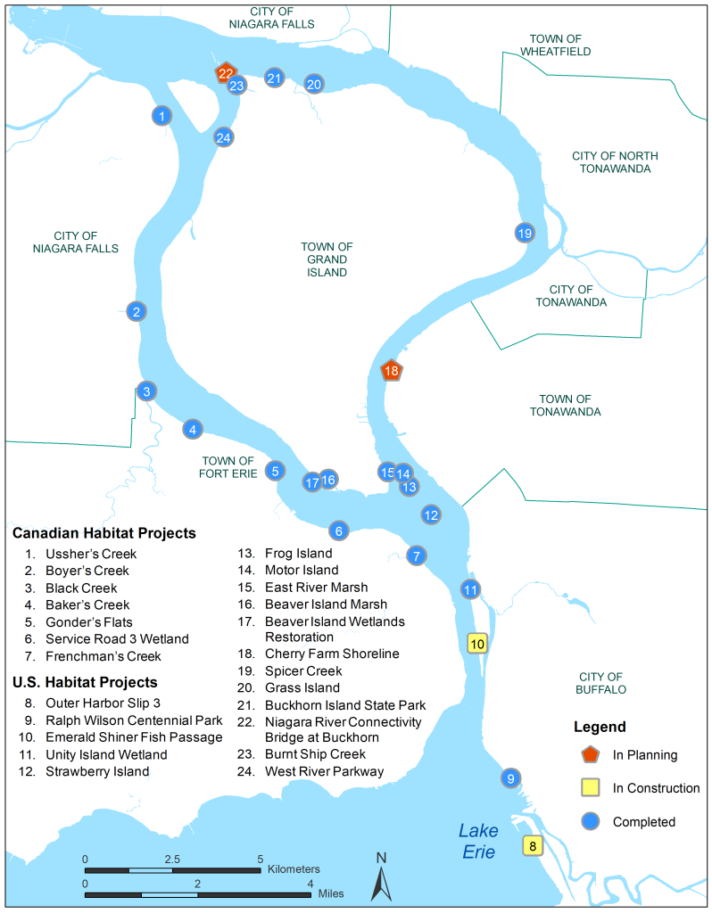 Niagara River Habitat Restoration Projects completed and planned (not completed) as of 2021.